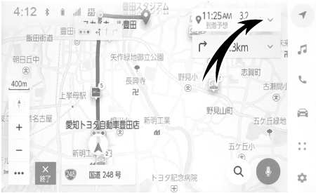 地図画面で[]にタッチします。[ルートオプション](→ルートオプションを変更する)または[他の経路](→他の経路に変更する)にタッチします。再探索する条件にタッチします。[OK]または[決定]にタッチします。