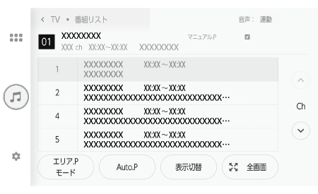 • リヤマルチオペレーションパネルのオーディオ操作画面で、[]>[番組表]の順に選択します。