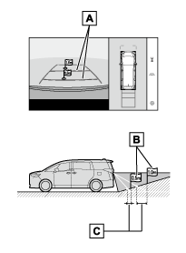 • バックカメラが取り付けられたバックドア、サイドカメラを内蔵したドアミラーが取り付けられたフロントドアが開いている場合、パノラミックビューモニターは正しく表示されません。