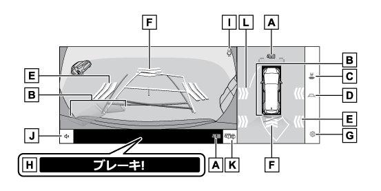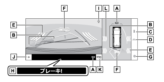 • 乗車人数、積載量、路面の勾配などにより、画面のガイド線の示す位置はかわります。必ず後方や周囲の安全を直接確認しながら運転してください。