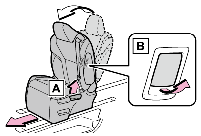 シートを調整しているときは、シートの下や動いている部分の近くに手を近付けないでください。指や手を挟み、けがをするおそれがあります。