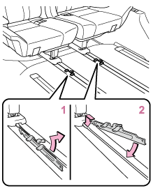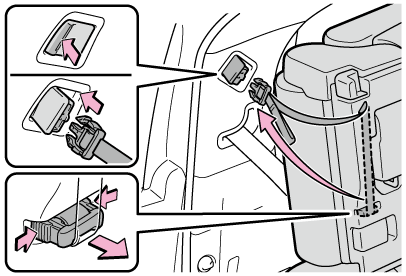 シート固定ベルトの上下のツメを押してはずし、シートクッション裏側に格納します。