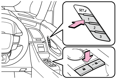 運転席ドア以外のドアをスマートエントリー&スタートシステムで解錠した場合は、ドライビングポジションの呼び出しは行われません。その場合は、登録したドライビングポジションのボタンを押してください。