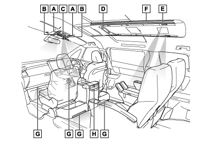 - ルームランプ(→ルームランプを操作するには)/フロントパーソナルランプ(→フロントパーソナルランプを操作するには)