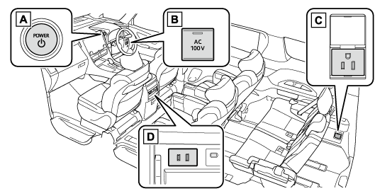 車内において、AC100Vで消費電力の合計が1500W の電気製品を使用することができるシステムです。(→アクセサリーコンセントを使用するには)