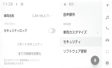 個人情報保護のための、パスワードによるセキュリティロックを有効にできます。設定をONにすると、12Vバッテリー交換による再起動時やマルチメディアシステムを車両から脱着した際に、マルチメディアシステム操作をするためのパスワード入力が必要です。