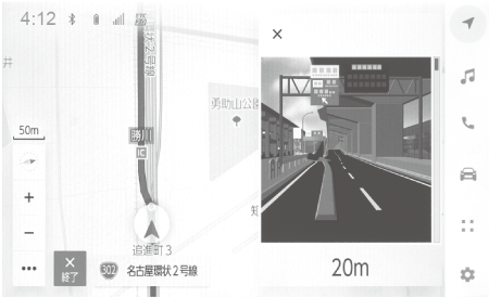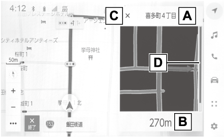 目的地案内中で、現在地がルート上にあるとき、分岐する交差点に近づくと、交差点拡大図に切りかわります。