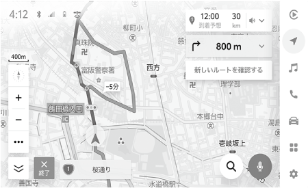 [新しいルートを表示]にタッチします。比較画面を表示中に操作しなかったとき、または新ルートと元ルートの分岐点を通過したときは、元ルートで案内します。新旧ルート比較表示をONに設定したとき、新旧ルート比較表示ができます。