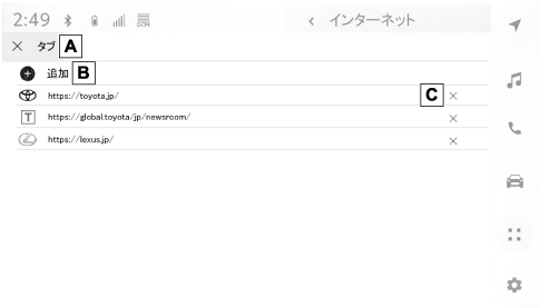 タブ管理画面ではタブの切り替え/追加/削除を行うことができます。