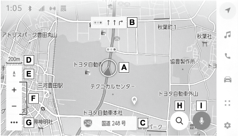 地図画面上に表示される情報の説明および役割を説明します。地図画面を表示するには、メインメニューの[