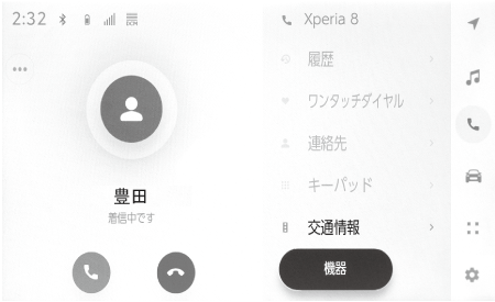 着信があると着信音が鳴り、着信画面もしくは着信通知が表示されます。音声操作の設定で、[通知表示中の発話受付]がON の場合、着信したときにエージェント(音声対話サービス)が起動します。(→音声操作の設定を変更する)