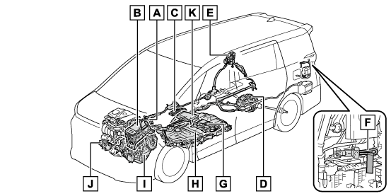 ハイブリッドシステムには、駆動用電池・パワーコントロールユニット・オレンジ色の高電圧ケーブル・電気モーターなどの高電圧部位(最高約650V)や、冷却用ラジエーターなどの高温部位がありますので、ご注意ください。ご使用前に、ここで説明している内容をよくお読みいただき、正しく取り扱ってください。なお、高電圧部位には、取り扱い上の注意喚起のため