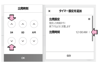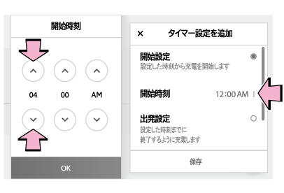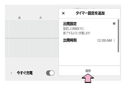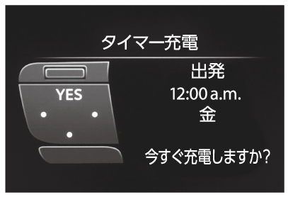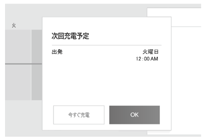 車両のシステムにより、設定した出発時刻までに充電が完了できないと判断された場合は、 すぐに充電が開始されます。その際は、タイマー充電の設定時刻を確認してください。
