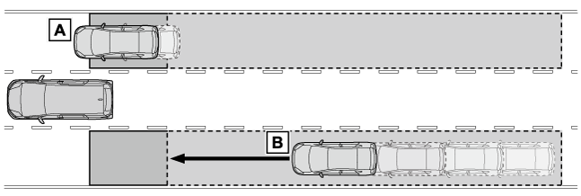 - ドアミラーインジケータードアミラーの死角領域に車両を検知したとき、または後方からその死角領域に急速に接近してくる車両を検知したときは、検知した側のドアミラーインジケーター(→表示灯一覧)が点灯します。検知した側に方向指示レバーを操作している場合は、ドアミラーインジケーターが点滅し、ブザーが鳴ります。