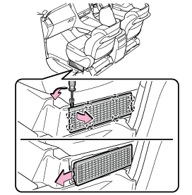 - 排気口カバーを取りはずす傷が付くのを防ぐため、マイナスドライバーの先端に布などを巻いて保護してください。図で示す8ヶ所のツメをはずし、排気口カバーを手前に引いて取りはずします。