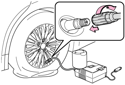 タイヤがパンクしたときは、タイヤパンク応急修理キットで応急修理することができます。釘やネジなどが刺さった程度の軽度なパンクを応急修理できます。(パンク補修液1本につき、応急修理できるタイヤは1本です)パンクしたタイヤの損傷状況により、応急修理キットでは応急修理できない場合があります。(→応急修理キットで修理できないパンク)