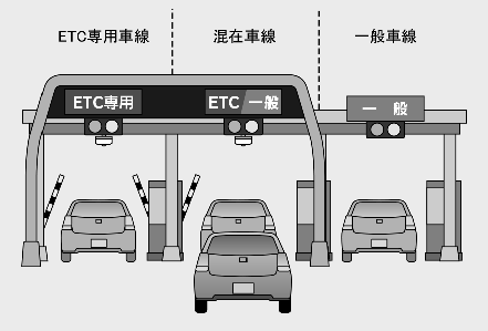 ETC料金所には、料金支払い方法に応じて、ETC専用車線、一般混在車線、一般車線、サポート混在車線またはサポート車線があります。ETCを利用する場合は、ETC専用車線、一般混在車線またはサポート混在車線に進入してください。