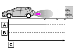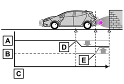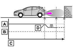 PKSB(パーキングサポートブレーキ)は、衝突の可能性がある作動対象(壁などの静止物や後方接近車両)を検知したとき、ハイブリッドシステムの出力を抑制することにより車速の上昇を抑えます。(ハイブリッドシステム出力抑制制御:図2)また、そのままアクセルペダルを踏み続けた場合は、ブレーキをかけ減速させます。(ブレーキ制御:図3)