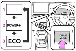 ドライブモードセレクトスイッチを押すたびに、ノーマルモード、パワー+モード、エコドライブモードの順で切りかわります。ドライブモードは、ほかのドライブモードに切りかえるまで解除されません。(パワースイッチをOFFにしても自動では解除されません)