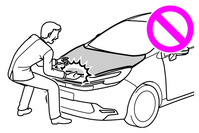 走行後のボンネットステーは高温になっています。熱くなったボンネットステーにさわるとやけどなどの重大な傷害を受けるおそれがあります。