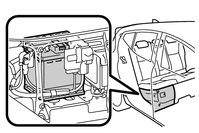 この車両の補機バッテリーはリヤシート下側にあり、エンジンルームには搭載されていません。補機バッテリーがあがってしまったときは、エンジンルーム内にある救援用端子を使用して、処置を行います。(補機バッテリーがあがったときは)