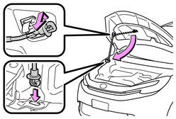 ボンネットステーをステー穴から取りはずし、クリップに正しくもどしてください。ボンネットステーが差し込まれた状態で閉めると、ボンネットが損傷するおそれがあります。