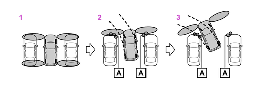 走行中にサイドセンサーまたはサイドカメラで静止物を検知します。車両が移動して静止物がサイドセンサーまたはサイドカメラで検知できない位置にあった場合も、車両の位置を計算することで静止物の位置を算出し、車両の経路内に静止物がある場合に、巻き込み警報機能が作動します。