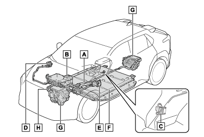 EVシステムには、駆動用電池・ESU・オレンジ色の高電圧ケーブル・電気モーターなどの高電圧部位(公称約355.2V)や、冷却用ラジエーターなどの高温部位がありますので、ご注意ください。ご使用前に、ここで説明している内容をよくお読みいただき、正しく取り扱ってください。なお、高電圧部位には、取り扱い上の注意喚起のため表示を含んだラベルが貼付されています。