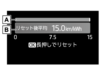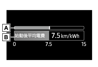 電力消費率を表す数値で、ガソリンエンジン車の燃料消費率に相当します。この車では、電力1キロワット時(1kWh)あたりの走行キロ数(km/kWh)が、「電費」として各画面上に表示されます。