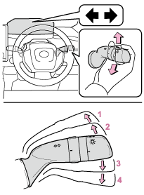 操作のしかた左折左側へ車線変更(レバーを途中まで動かして離す)左側方向指示灯が5回点滅します。右側へ車線変更(レバーを途中まで動かして離す)右側方向指示灯が5回点滅します。右折知識作動条件パワースイッチがONのとき表示灯の点滅が異常に速くなったときはトヨタ販売店で点検を受けてください。