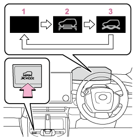 停車時または車速約20 km/h未満で走行中、目的の走行モードに切り替わるまで、X-MODEスイッチをくり返し押します。