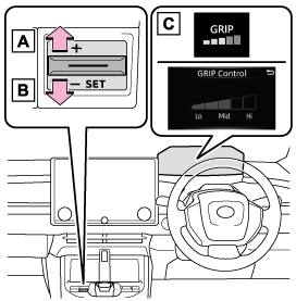 グリップコントロールでは、アクセルペダルやブレーキペダルを踏まなくても、急な坂道や滑りやすい路面で低い車速を維持し、運転者の操作をサポートします。
