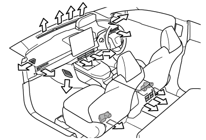 運転席外側吹き出し口の近くでスプレーを使用したり、吹き出し口にものをはめ込んだり貼ったりしないでください。正常に働かなくおそれがあります。
