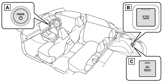 車内において、AC100Vで消費電力の合計が1500Wの電気製品を使用することができるシステムです。(→アクセサリーコンセントを使用するには)