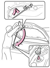 ボンネットステーをステー穴から取りはずし、クリップに正しくもどしてください。