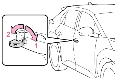 電子キーと車両間の通信がさまたげられたり(→機能が正常に働かないおそれのある状況)、電子キーの電池が切れたときは、スマートエントリー&スタートシステムとワイヤレスリモコンが使用できなくなります。このような場合、次の手順でドアを開けたり、EVシステムを始動したりすることができます。