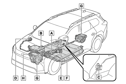 EVシステムには、駆動用電池・ESU・オレンジ色の高電圧ケーブル・電気モーターなどの高電圧部位(公称約391.0V)や、冷却用ラジエーターなどの高温部位がありますので、ご注意ください。ご使用前に、ここで説明している内容をよくお読みいただき、正しく取り扱ってください。なお、高電圧部位には、取り扱い上の注意喚起のため