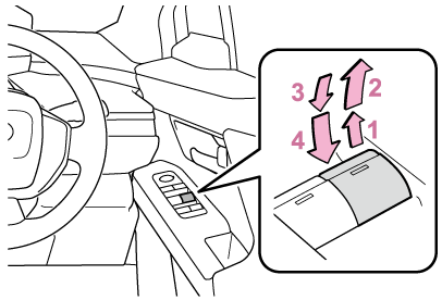 車を停止し、パワースイッチをONの状態で、挟み込み防止機能や、巻き込み防止機能が作動したあと約4秒以内に、パワーウインドウスイッチを「自動全閉」の位置で引き続ける。または、「自動全開」の位置で押し続けることでドアガラスを開閉することができます。