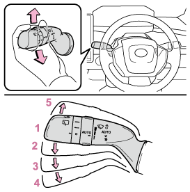 ウォッシャー液を出すレバーを手前に引くとワイパーと連動してウォッシャーが作動します。(数回作動したあと、液だれ防止としてさらに1回作動します。ただし、走行中は液だれ防止作動は行いません。)ヘッドランプが点灯しているときに5回連続で手前に引くとヘッドランプクリーナーが作動します。