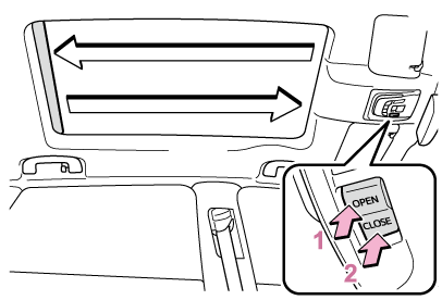 - スイッチの“CLOSE”側を押し続ける全閉付近の位置まで閉じ、停止します。その後、開く方向に作動してから全閉位置で停止します。途中でスイッチから手をはなすと、最初からやり直しとなります。以上の操作を行っても自動全開/自動全閉機能が作動しない場合は、トヨタ販売店で点検を受けてください。