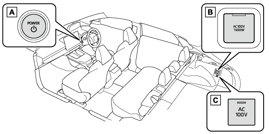 車内において、AC100Vで消費電力の合計が1500Wの電気製品を使用することができるシステムです。(→アクセサリーコンセントを使用するには)