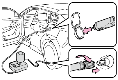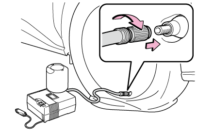 手順どおりに行わないとパンク補修液が噴出する場合があります。