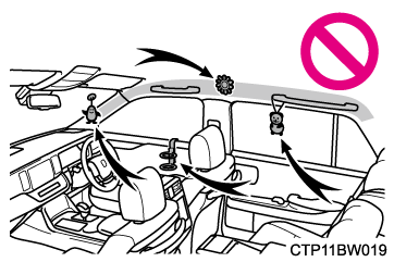 ドア・フロントウインドウガラス・ドアガラス・フロントピラーおよびリヤピラー・ルーフサイドレール・アシストグリップなどには何も取り付けない(速度制限ラベルを除く:→応急修理するときは)