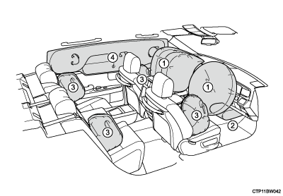 次のSRSエアバッグは、側面や後方からの衝撃・横転・または低速での前方からの衝撃では、通常は作動しません。ただし、それらの衝撃が前方への減速を十分に引き起こす場合には、作動することがあります。