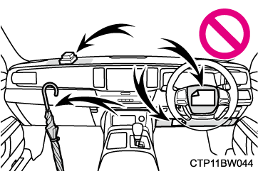 ダッシュボード・ハンドルのパッド部分・インストルメントパネル下部などには何も取り付けたり、置いたりしない
