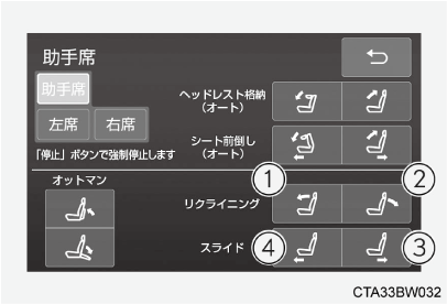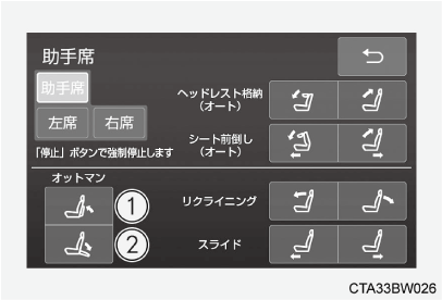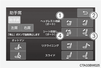 助手席に乗員がいるときは操作をしないでください。また、操作中やヘッドレストが前倒しになっているときは、助手席に座らないでください。