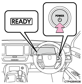 表示されないと、ハイブリッドシステムは始動しません。 - パワースイッチを短く確実に押す短く確実に押せば、押し続ける必要はありません。READYインジケーターが点灯すれば、ハイブリッドシステムは正常に始動しています。READYインジケーターが点灯するまでブレーキペダルを踏み続けてください。パワースイッチのどのモードからでもハイブリッドシステムを始動できます。