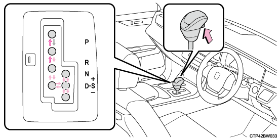 シフトレバーを“-”側へ操作したとき、走行状態に適したエンジンブレーキ力を得られるレンジにダウンします。