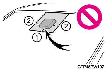 フロントウインドウガラスの前方カメラ前部(図に示す範囲内)にステッカー(透明なものを含む)などを貼り付けない