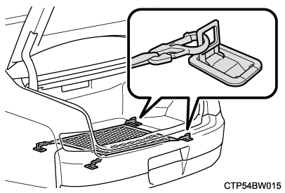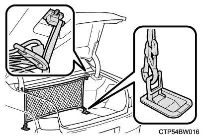 ラゲージネットを使用しないときは、必ず固定用フックをもとの位置にもどしておいてください。トランク内の荷物または固定用フックが破損するおそれがあります。